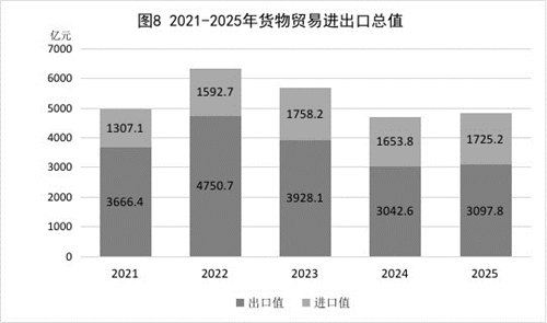 全年货物贸易进出口总值4823.0亿元,比上年增长2.7%。其中,出口值3097.8亿元,增长1.8%;进口值1725.2亿元,增长4.3%。对共建“一带一路”国家进出口2658.2亿元,增长13.9%,占全省外贸比重55.1%。