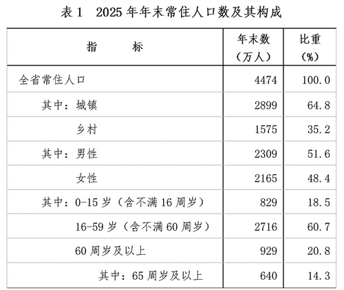 年末全省常住人口4474万人,比上年末减少28万人。其中,城镇常住人口2899万人,占总人口的比重(常住人口城镇化率)为64.80%,比上年末提高1.03个百分点。全年出生人口24.8万人,比上年减少5.2万人;死亡人口33.7万人,增加1.1万人。人口出生率5.53‰,比上年下降1.12个千分点;人口死亡率7.51‰,上升0.28个千分点;自然增长率-1.98‰,下降1.40个千分点。