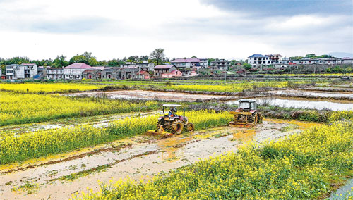 3月27日,奉新县赤田镇童家村新闵组,村民驾驶农机翻耕农田,为早稻播种做准备。