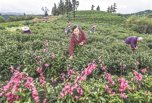 3月27日,资溪县陈坊林场茶产业科技园白茶种植基地,农妇在采摘明前茶。特约通讯员 吴志贵摄