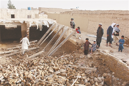 3月29日,在阿富汗坎大哈省,人们查看在强降雨中损毁的房屋。阿富汗国家灾害管理部门3月29日表示,28日至29日在该国多地出现的强降雨已造成至少17人死亡、26人受伤。新华社/美联
