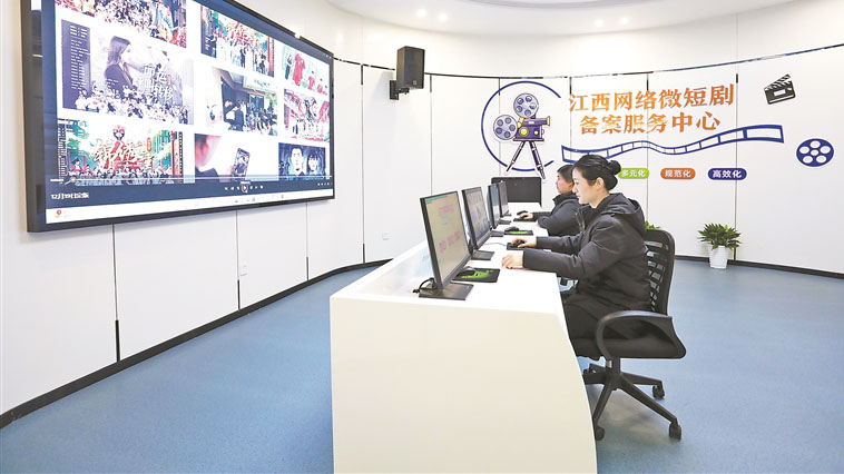 审批流程分散、版权维权滞后,一度拖住微短剧产业发展脚步。赣江新区精准捕捉痛点,打造江西网络微短剧备案服务中心,组建16名“剧管家”服务队伍,推出“3+5”服务模式:备案初审3个工作日、成片预审5个工作日,跑出全国最快审批速度。