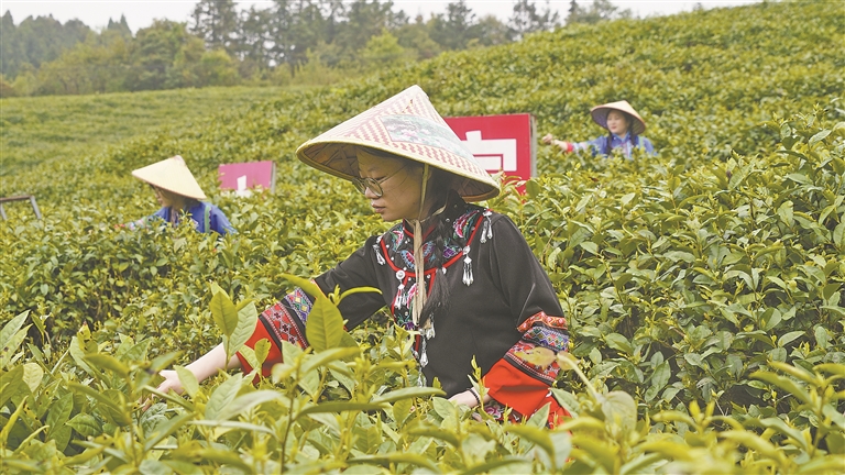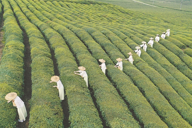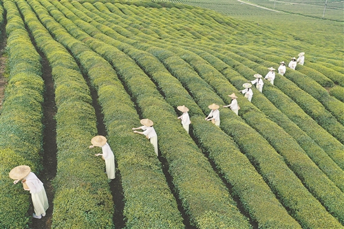 4月1日,上高县新界埠镇茗达茶场举行明前茶开采仪式,茶园内一派忙碌景象。 特约通讯员 陈旗海摄