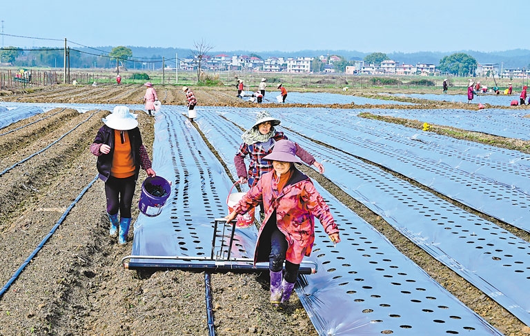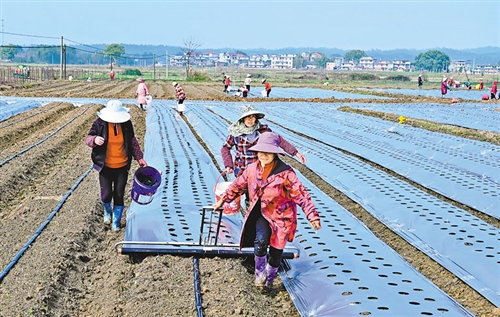 3月23日,永丰县七都乡曾家村村民在基地覆膜,移栽甜叶菊。近年来,该县大力发展竹笋菇、甜叶菊等特色产业,助力乡村振兴、群众增收。本报全媒体记者 曹章保摄