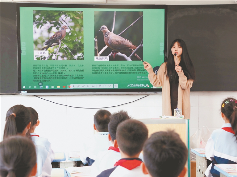 4月1日,分宜县林业局工作人员来到该县第四中心小学,开展第四十五届“爱鸟周”宣传活动。工作人员给学生科普鸟类分类知识,介绍当地拥有的珍稀鸟类,激发学生爱鸟护鸟热情。特约通讯员 袁建兵摄