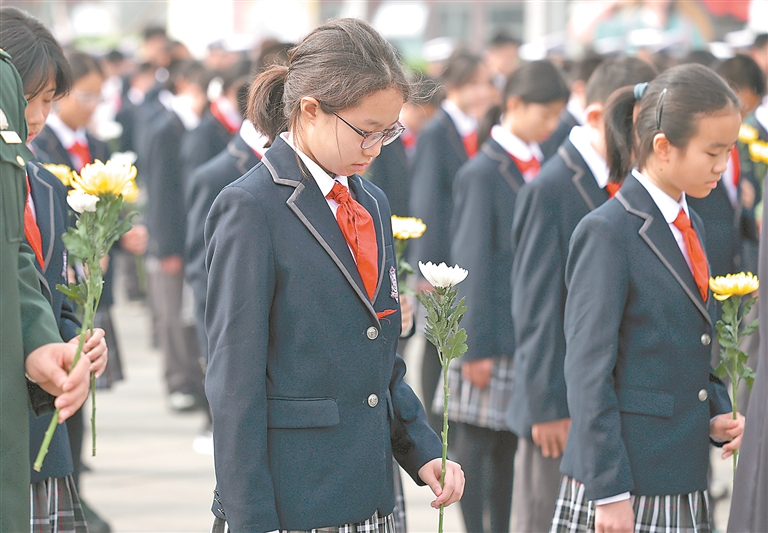 4月3日,学生代表在启动仪式上向抗战英烈默哀。