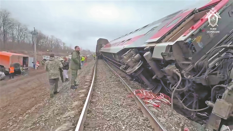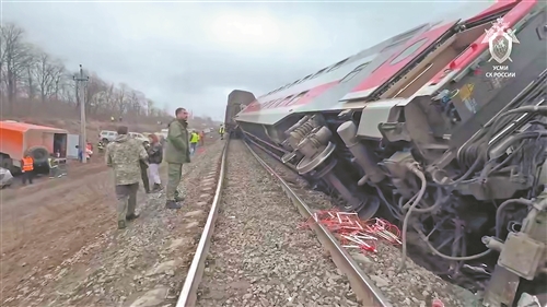 这张由俄罗斯调查委员会提供的视频截图显示,4月3日,调查人员在俄罗斯乌里扬诺夫斯克州的列车脱轨事故现场工作。