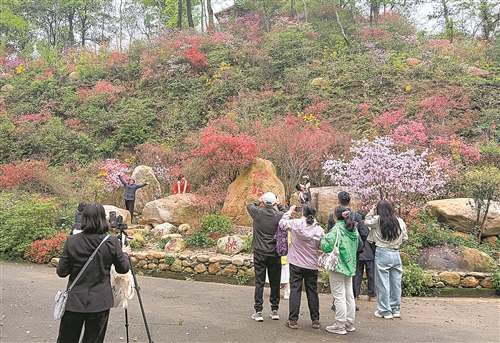 4月6日,位于南昌市新建区乐化镇岭背林场的中盛山庄,各色杜鹃花竞相绽放,吸引游客前来打卡拍照。本报全媒体记者 田野摄