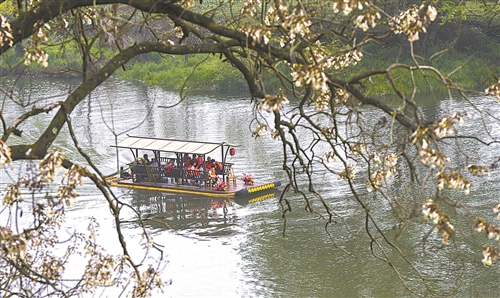 4月5日,婺源县秋口镇石门月亮湾景区春意盎然,游客乘竹筏泛舟江上,沉浸式体验乡村春日风光。通讯员 王国红摄