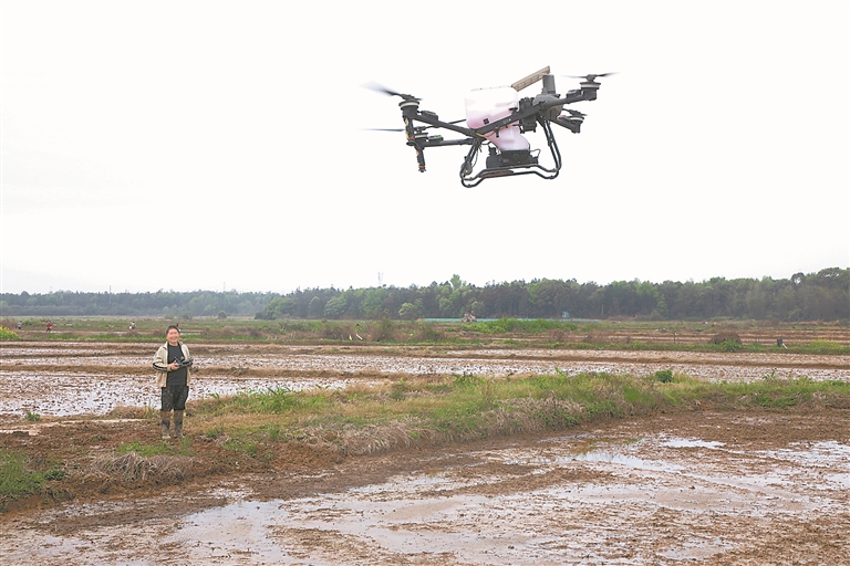 | 4月2日,在抚州市东乡区圩上桥镇邮路头村水稻种植基地,种粮大户操作植保无人机,进行播种作业。 通讯员 占人豪摄 |