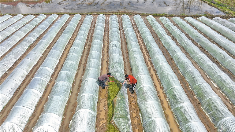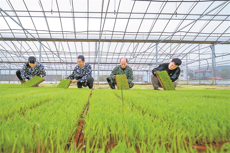 广袤稻田上,农户积极翻耕整地,一行行嫩绿的秧苗整齐“落户”;蔬菜大棚里,农技人员蹲在苗床前,手把手指导农户进行秧苗管理。