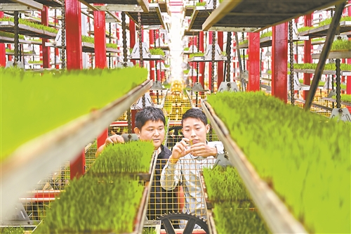 | 3月25日,赣州市南康区横市镇农事综合服务中心智慧育秧工厂内,青年“新农人”正在观察立体循环式育秧架上的秧苗培育情况。特约通讯员 朱海鹏摄 |