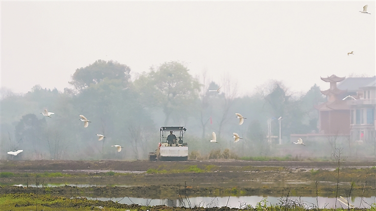 | 3月29日,上高县蒙山镇钧石塘村,穿梭的农机、忙碌的农人与翻飞的白鹭,构成了一幅人与自然和谐共生的美丽画卷。特约通讯员 陈旗海摄 |