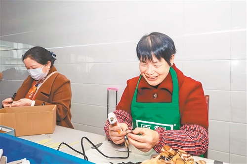 为破解群众就业与顾家两难的痛点,工坊精准施策,推行不打卡、来去自由的弹性工时。村民钟建南便是这一模式的直接受益者,他要接送孙辈、照料老人,时间和精力十分有限。入职工坊后,他根据家庭需求灵活安排上下班时间,既没有耽误照顾家人,每月还能增收2000余元,实现顾家、就业、增收三不误,日子也愈发安稳舒心。