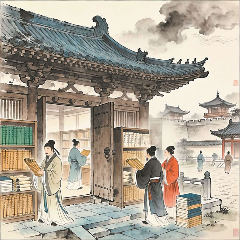 老子曾担任周朝“柱下史”的职务——为周朝设置的“专司图书”的官方职务,主要任务就是为国家看管和保护图书、文卷、档案等,同时须开展研究和传播,只不过当时的图书比较零碎、难成大的系统。汉朝初立,丞相萧何专门派人收集和贮藏先秦图书、典册,他深知这些极其宝贵的思想文化财富对于治理国家、以文化人的极端重要性,因此,汉朝罢黜百家、独尊儒术,此后的封建王朝均采取这一策略。值得一提的是,汉帝国还设置了“兰台”这样的文化机构和官僚系统,“兰台”一词直到今天依然是图书馆、档案馆的代名词;另外,当时还设置了“博士”等关于历史文化图书类的官职。当时的竹简(绢帛、纸张价格昂贵比较少用)比较笨重,其单位信息的储存量相当有限,于是便有了学富五车、汗牛充栋等成语的出现,放到今天可能远不如一个小小的U盘的存储量,但在那个时代却非常了不起。