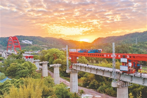 4月7日,会昌县文武坝镇林苏村,瑞梅铁路湘水特大桥连续梁架设作业现场一片火热,建设者加紧施工,全力推进项目建设,为会昌段全线铺轨奠定基础。瑞梅铁路建成通车后,将结束我省寻乌、安远两县和广东省平远县无铁路历史。特约通讯员 朱海鹏摄