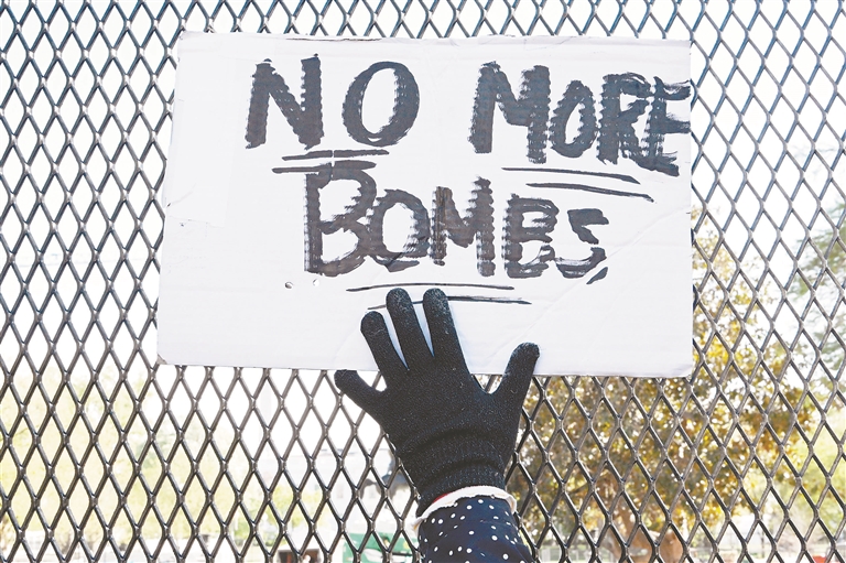 4月7日,一名示威者在美国首都华盛顿的白宫前手举标语。 美国总统特朗普4月7日傍晚在社交媒体发文表示,他已同巴基斯坦总理夏巴兹和陆军参谋长穆尼尔对话,对方请求美方暂缓空袭伊朗,“我同意暂停对伊朗的轰炸和袭击两周,前提是伊朗伊斯兰共和国同意全面、立即且安全地开放霍尔木兹海峡”。“这将是一次双向停火。” 新华社记者 李 睿摄