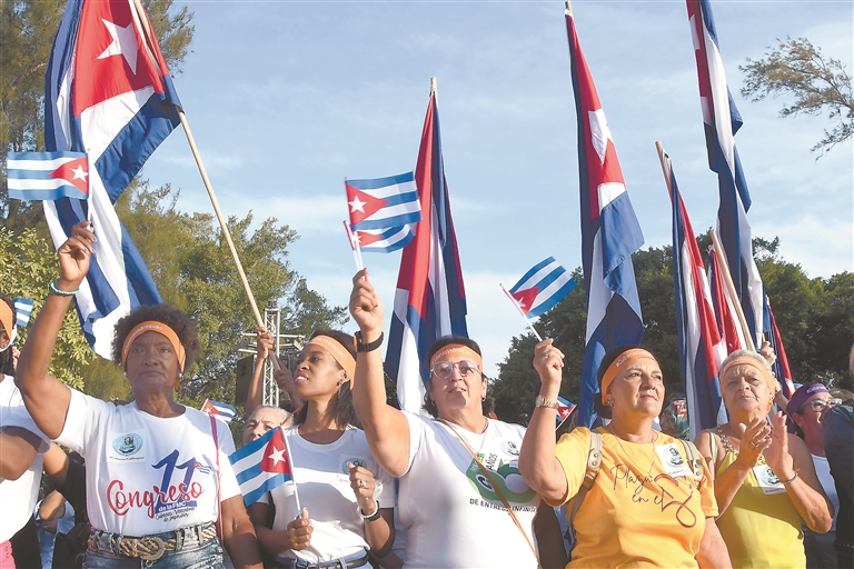 4月7日,在古巴首都哈瓦那,妇女们在集会现场挥舞古巴国旗,谴责美国对古封锁。 数百名古巴妇女4月7日聚集在古巴首都哈瓦那贝达多区的玛丽安娜·格拉哈莱斯公园,纪念古巴革命杰出人物、古巴共和国女英雄维尔玛·埃斯平诞辰96周年,谴责美国对古巴长期实施的封锁。 新华社发 (华金·埃尔南德斯摄)