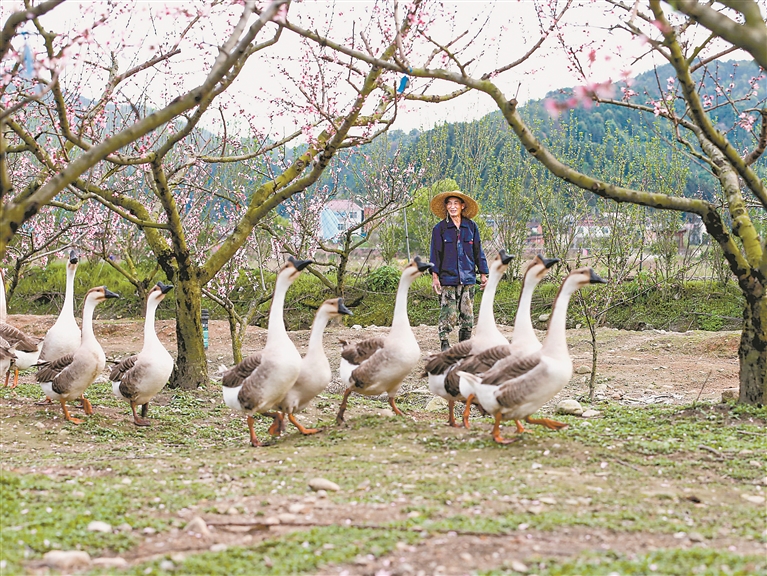 4月9日,广昌县头陂镇羡地村村民在黄桃园里放养灰鹅。据了解,该果园采取“林+禽”立体生态种养模式,在林下养殖灰鹅260多只,预计种养收入超20万元。 特约通讯员 曾恒贵摄