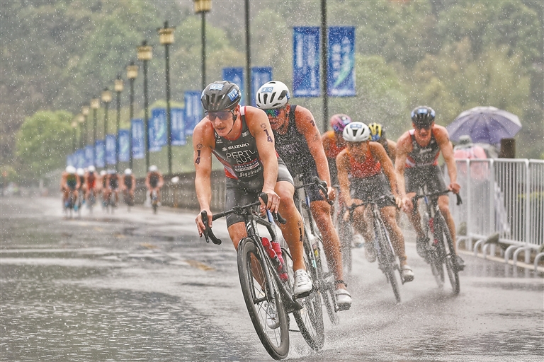 4月11日,德兴市凤凰湖景区,参加铁人三项比赛的运动员在大雨中奋力骑行。当天,2026年江西德兴铁人三项亚洲杯赛暨中国铁人三项联赛开赛,来自19个国家和地区的千余名选手齐聚凤凰湖,在山水之间展开耐力与意志的激烈比拼。