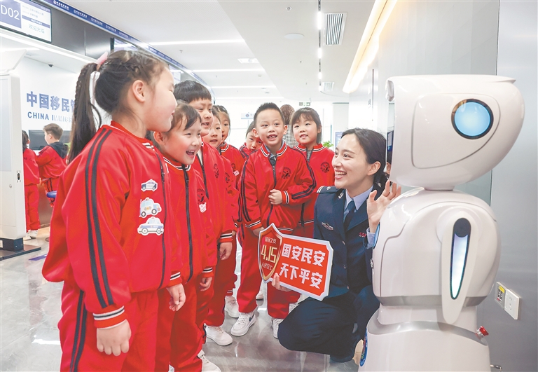 4月13日,在江苏省扬州市公安局江都分局出入境管理大队,扬州市江都区一幼儿园的小朋友们通过与机器人对话了解出入境安全知识。今年4月15日是第十一个全民国家安全教育日,活动主题为“统筹发展和安全 护航‘十五五’新征程”。各地开展形式多样的主题宣传教育活动,提高人们的国家安全意识。 新华社发(任 飞摄)
