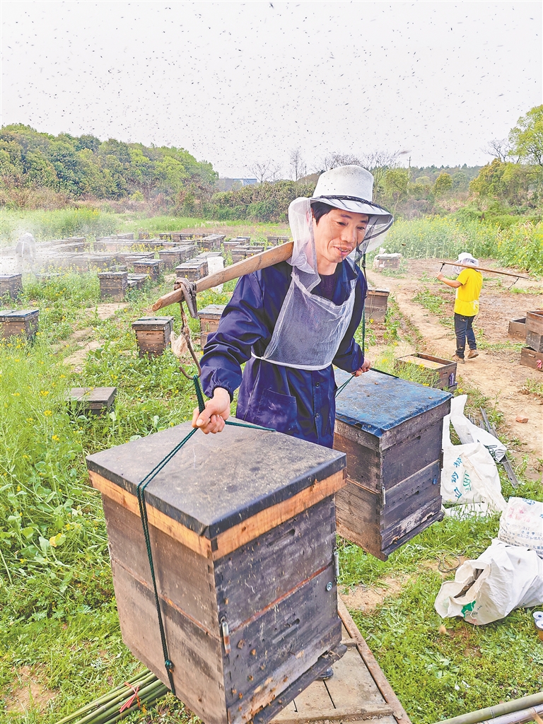 4月初的弋阳县湾里乡庙前村,田野里的油菜花还留着最后一抹金黄,养蜂人葛旗明的200多箱意蜂已整装待发。这群跟着他走南闯北10多年的“老伙计”,即将开启今年的旅程:先赴江苏采油菜蜜,再转山东收山楂蜜与槐花蜜,6月深入内蒙古草原,直到10月才会回到弋阳。