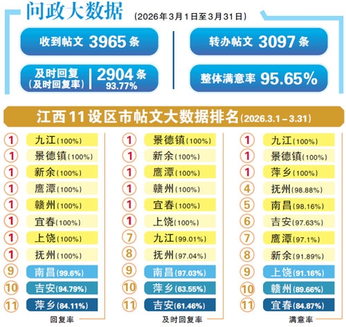 本报讯 (全媒体记者陈志燕)4月14日,大江新闻《问政江西》栏目3月问政大数据出炉。数据显示,3月1日至31日,栏目共收到群众投诉建议帖文3965条,其中3097条帖文证据相对充足、内容翔实,已转到各职能部门办理;收到3060条回复,其中及时回复2904条,及时回复率93.77%,整体满意率95.65%。景德镇及时回复率和满意率均为100%。