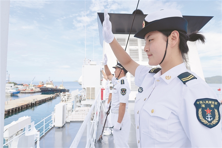 4月15日,执行“和谐使命-2025”任务的中国海军“丝路方舟”号医院船离开巴布亚新几内亚莫尔兹比港。这是医院船官兵分区列队。 中国海军“丝路方舟”号医院船4月15日结束对巴布亚新几内亚的友好访问与医疗服务,驶离莫尔兹比港起程回国。巴新是“丝路方舟”号医院船执行“和谐使命-2025”任务的最后一站。访问巴新期间,医院船接诊5635人次,实施手术操作361例,收治住院16人。 新华社发 (崔晓洋摄)