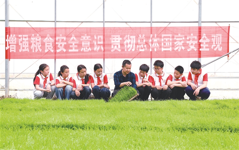 4月9日,在丰城市秀市镇佳和种植专业合作社,种粮大户雷应国向秀市中心小学的学生讲解育秧相关知识,增强学生国家安全意识和素养。王 堃摄