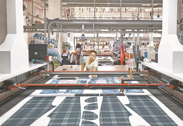 铅山县依托数字技术与高端智造赋能,集聚3D印花企业超3000家,年交易额超60亿元。图为4月17日,位于铅山数码印花产业城的上饶市美声服饰有限公司生产车间内,工人正对3D打印的个性花布进行数码剪裁。本报全媒体记者 徐 铮摄
