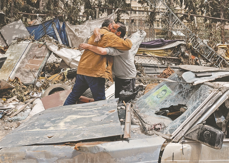 4月18日,在黎巴嫩奈拜提耶,重返家园的人们在一辆损毁的汽车旁拥抱。 黎巴嫩和以色列于当地时间17日零时正式开始为期10天的停火后,黎南部因战火流离失所的民众纷纷返回家园。 新华社/路透