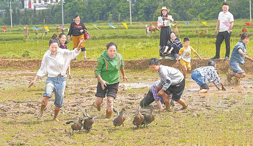 活动现场还特设趣味农事体验区,稻田摸鱼、水田抓鸭引得阵阵欢笑,人们在泥地里追逐嬉戏,重拾质朴的乡村童趣。田边亭下,村民们打糍粑、品点心,江南稻作区独有的民俗风情在此鲜活再现。