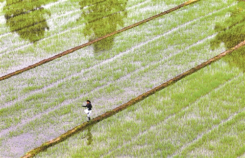 4月15日,泰和县苏溪镇上彭村,农民正在田间给早稻撒肥管护。当地积极开展早稻田间管理工作,引导农民加强水、肥管控,进行防病灭虫,确保早稻生长。邓和平摄