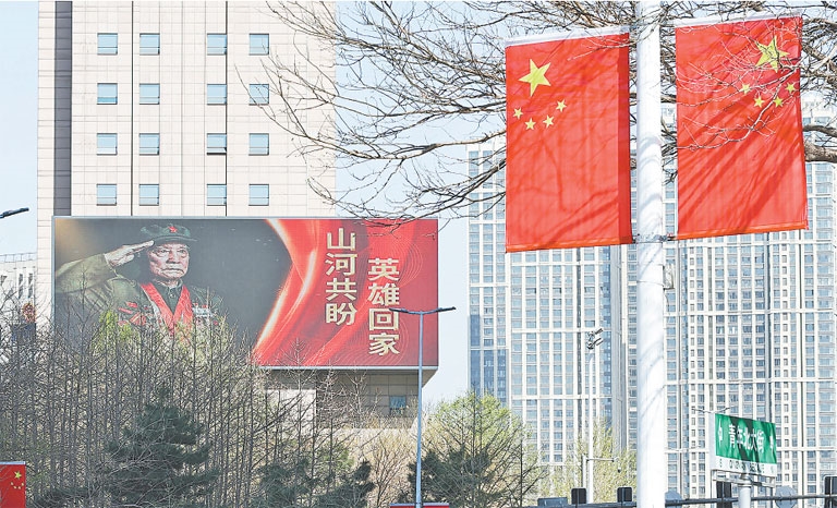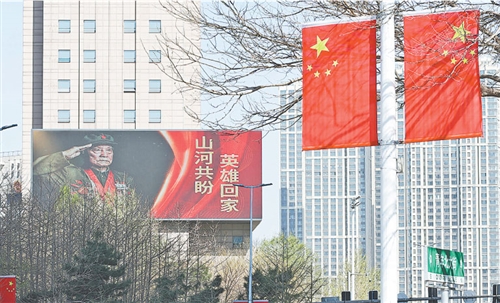 4月21日拍摄的沈阳街头的标语。第十三批在韩中国人民志愿军烈士遗骸将于4月22日回国。沈阳市以最高礼遇迎接英雄归来,炽烈“中国红”为英雄照亮回家路。新华社记者 李 钢摄