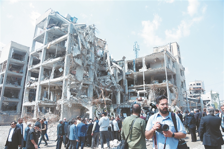 4月20日,在伊朗首都德黑兰,驻伊朗使节和外国媒体查看一处在美以袭击中被损毁的居民区建筑。 伊朗政府当日邀请驻伊使节和外国媒体探访此前在美以袭击中被损毁的古莱斯坦宫、甘地医院和居民区等建筑,介绍受损情况。 新华社记者 沙达提摄