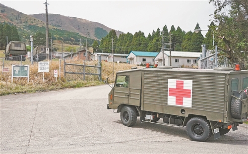 4月21日,一辆军用救护车抵达日本大分县陆上自卫队“日出生台演习场”。 日本防卫省说,4月21日上午,日本大分县陆上自卫队“日出生台演习场”在训练过程中发生弹药爆炸事故,造成3人死亡、1人重伤。 新华社/法新