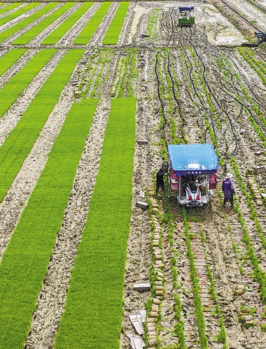 4月20日,庐山市沙湖山鄱阳湖湿地生态保护区高标准农田里,农民忙着栽插早稻秧苗。当地充分用好高标准农田建设成果,组织开展集约化育秧、机械化插秧、无人机施肥等农事作业。特约通讯员 韩俊烜摄