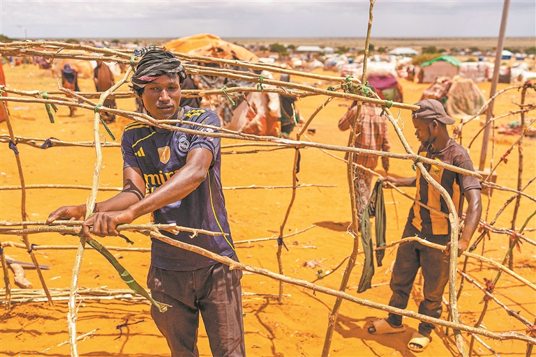 ▼4月21日,在索马里基斯马尤郊区,流离失所者在搭建临时住所。