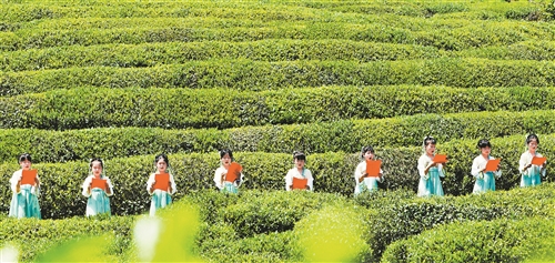 谷雨时节,春意盎然。德兴市新岗山镇联合市文联,在千年古村新建村举办谷雨诗会。活动吸引了众多文艺爱好者到场参与,大家以诗会友、共赏佳作,沉浸式感受诗词的独特魅力。图为德兴市新岗山镇新建小学的学生走进镇上的茶园基地,诵读经典古诗词。