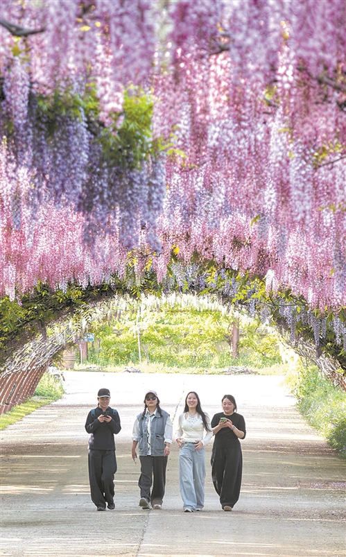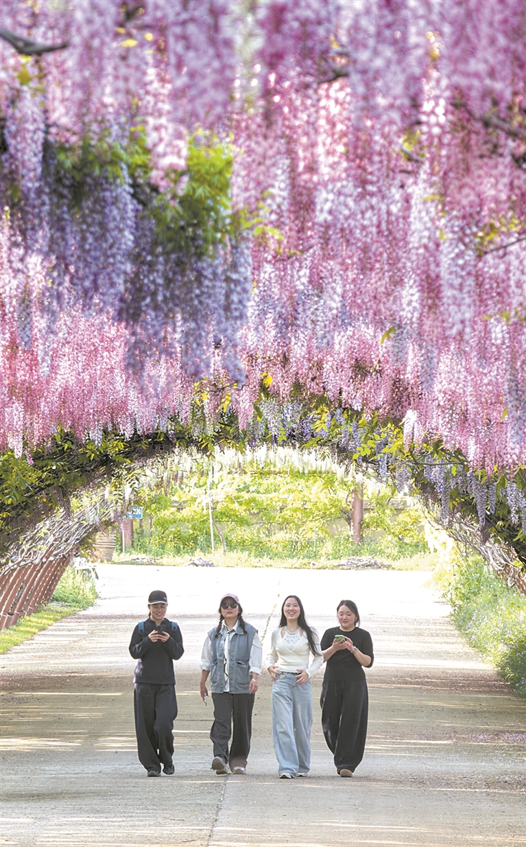 4月24日,人们在江苏南通紫藤花谷欣赏紫藤花。新华社发(许丛军摄)