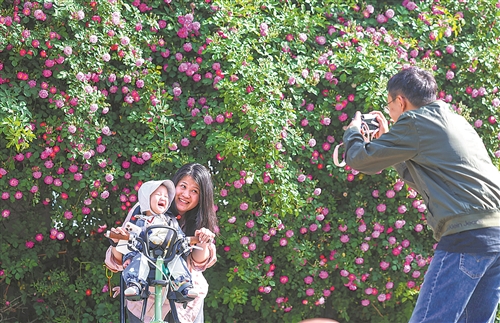4月24日,市民在河北石家庄蔷薇花墙前赏花拍照。新华社发(梁子栋摄)