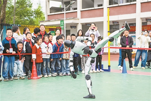 4月24日,铜鼓县科协举办的科普进校园活动走进高桥乡中心学校,让乡村孩子感受科技魅力。图为高桥乡中心学校学生近距离体验机器人互动项目。特约通讯员 周亮摄