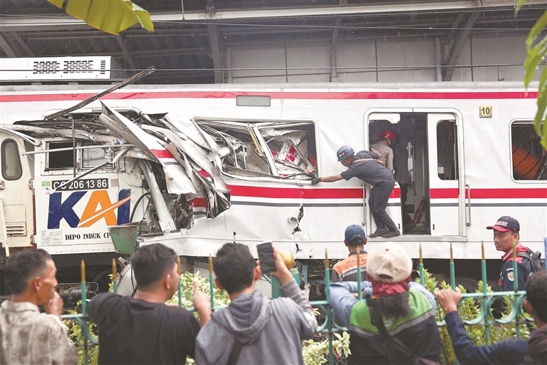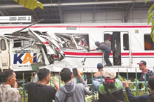 4月28日,技术人员在印度尼西亚勿加泗市的列车相撞事故现场工作。新华社/路透